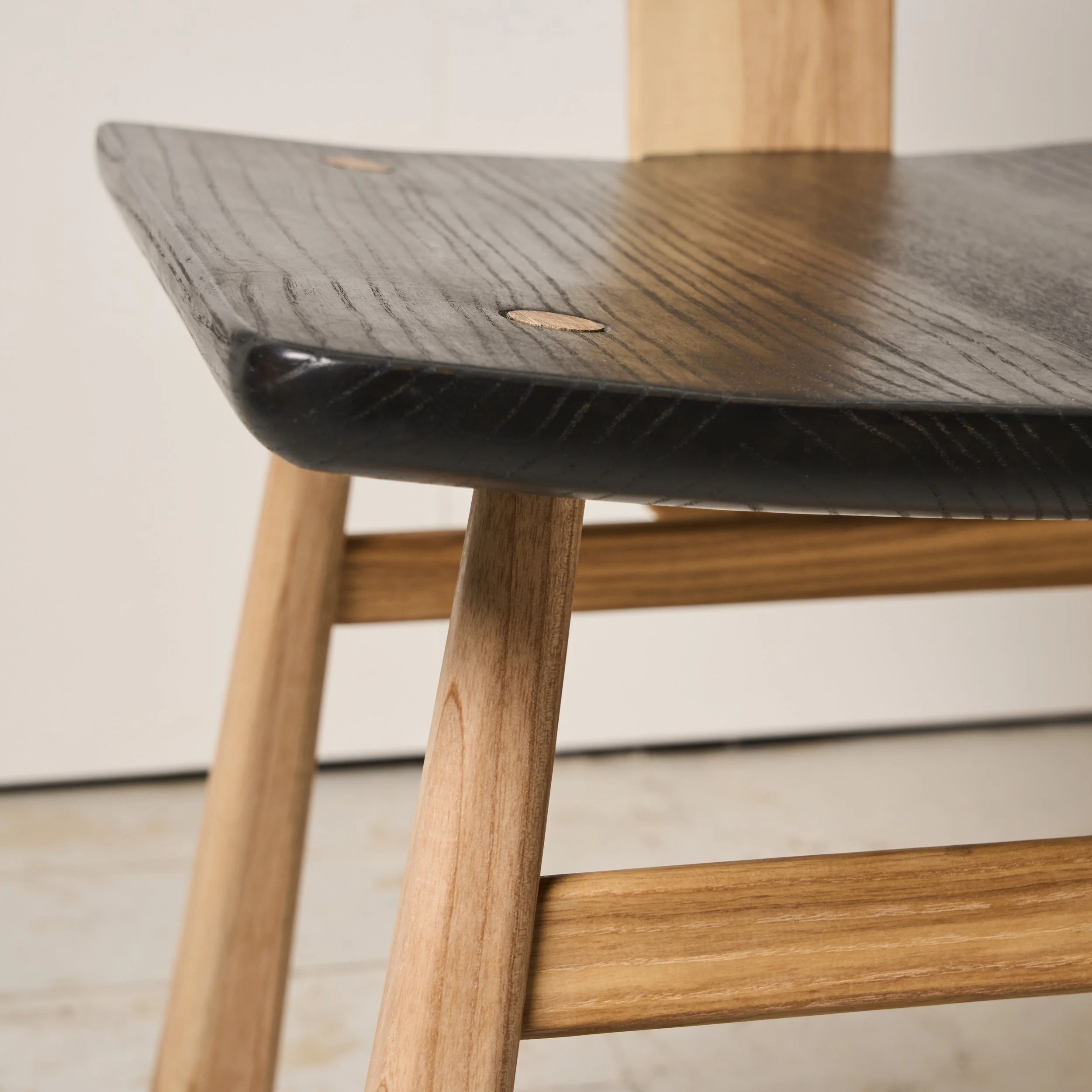 This chair merges playful geometry with refined craftsmanship. Its circular back and subtly curved seat, both rendered in ebonised ash, contrast with the angled legs made of natural ash, creating a bold yet balanced silhouette. Designed for comfort and visual clarity, the chairs exposed joinery highlights its handmade quality. Ideal as a dinning chair or accent piece in a contemporary interior.